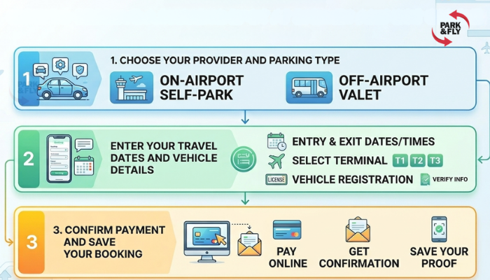 You reserve a parking spot at Sydney Airport online in three steps: pick your provider and parking type, enter your travel dates and vehicle details, then confirm payment. The whole process usually takes under five minutes if you’ve got your flight details handy.